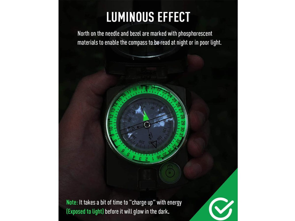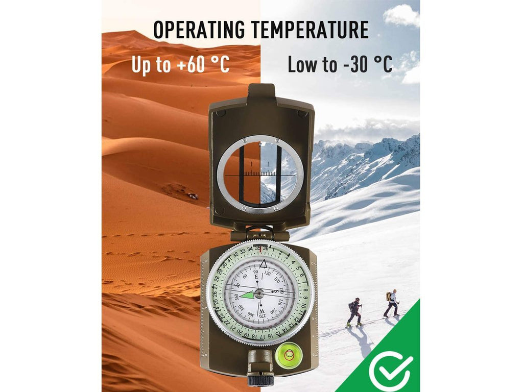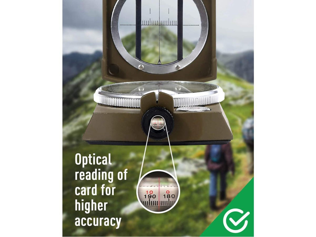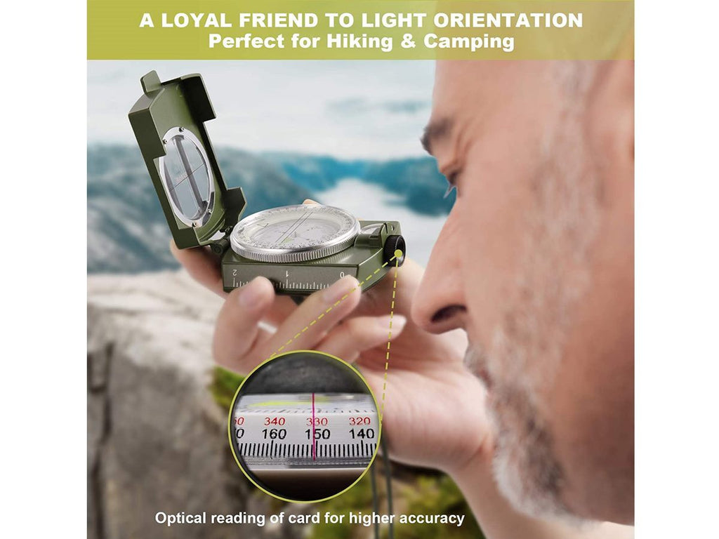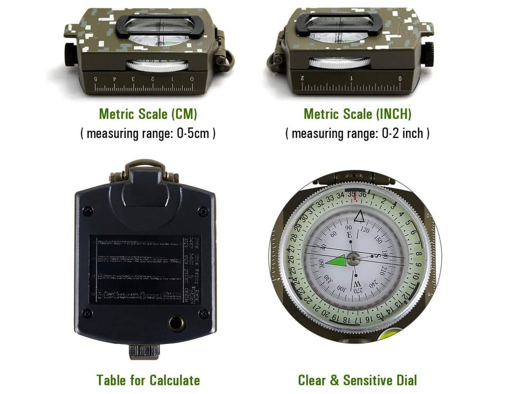 The green camouflage design adds a true outdoor style, while the advanced inner core mechanism ensures the dial plate won’t tilt or jam, preventing needle lock and maintaining high accuracy. With its 360° floating dial, adjustable lens prism, and fluorescent display, you can quickly and easily find your direction, even in low-light environments. The built-in bubble level further enhances precision for accurate navigation.