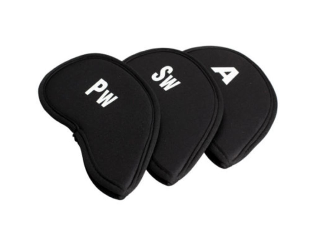 This auction is for a set of 10 golf iron head covers with easy-read number prints for quick club identification — including 3, 4, 5, 6, 7, 8, 9, PW, SW and A.