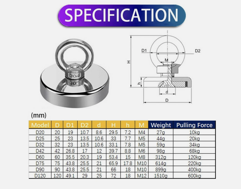 Salvage Magnet Recovery Neodymium Strong Magnetic Hook Treasure Hunting Fishing-- Diameter